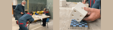 Je fais découvrir la taille de pierre et la mosaïque aux jeunes. Pour la taille de pierre je leur fais faire un dé et une fleur de lys et pour la mosaïque je leur fais faire le socle, sur lequel on pose le dé.