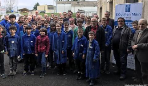 Le Président, les bénévoles et les enfants ont accueilli une délégation venue découvrir les ateliers en pleine activité. Cette rencontre a été programmée suite à la réunion du 9 décembre 2016 en préfecture de Bourg en Bresse. Animée par Michel Santoro Délégué du Préfet de l’Ain, Naïma Sefouane Les compagnons du devoir à Lyon et Marguerite Chevalier secrétaire générale de L'Outil en Main France, cette réunion avait permis de faire connaître le concept Outil en Main que Mme Marie-Annick Rey demeurant à Bourg en Bresse avait découvert en Haute Savoie. Le mercredi 22 mars 2017, pendant plus d’une heure, la visite des ateliers a séduit et suscité de nombreuses questions quant à la création d’association. La CMA 01 pourrait mettre à disposition des locaux à Bourg en Bresse. Ce dossier sera étudié par les administrateurs. Etaient présents : M. Michel Santoro, délégué du Préfet de l’Ain, Michel Voisin, député de la 4ème circonscription de circonscription de l’Ain - Mme Stéphanie Pernod Beaudon vice présidente de la région en charge de l’apprentissage et députée de l’Ain - M. Vincent Gaud, président de la CMA 01 et ses collaborateurs - M. Bernard Fialaire, président de la CC Saône Beaujolais, maire de Belleville sur Saône où est le siège de l’association - M. Guy Morillon, maire de Guéreins où sont domiciliés les ateliers - M. Nicolas Zielinsky maire adjoint de Montmerle sur Saône (papa d’un enfant (LOEM) - M. Roger Gaud président de la Fenara 01 et ses collaborateurs - Mme Gabrielle Comte, présidente du Rotary Club de Belleville en Beaujolais ses collaborateurs - Mme Marie-Annick Rey, retraitée M. Chevalier |